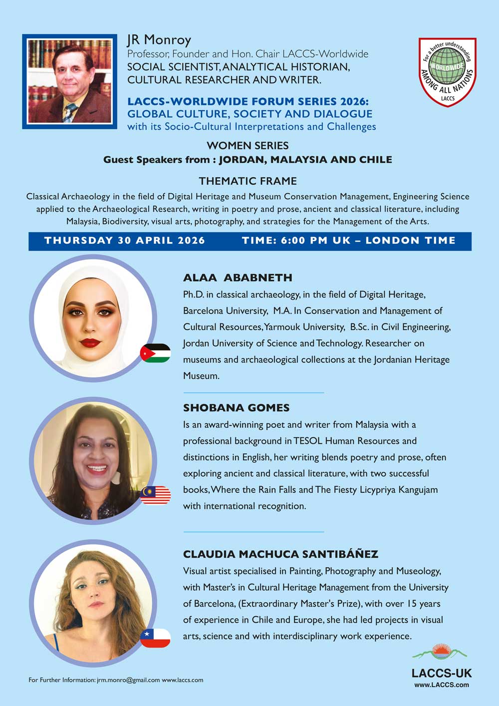 LACCS-WORLDWIDE continue with the women series inviting colleagues from the Americas, Europe, Middle and Far East, South East and South Asia and Africa to participate in a multinational and multicultural dialogue for searching ways of cooperation and understanding.