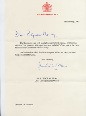A LETTER FROM BUCKINGHAM PALACE TO PROFESSOR J R MONROY | |